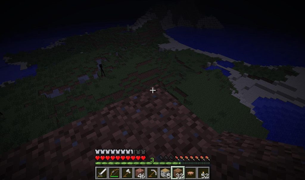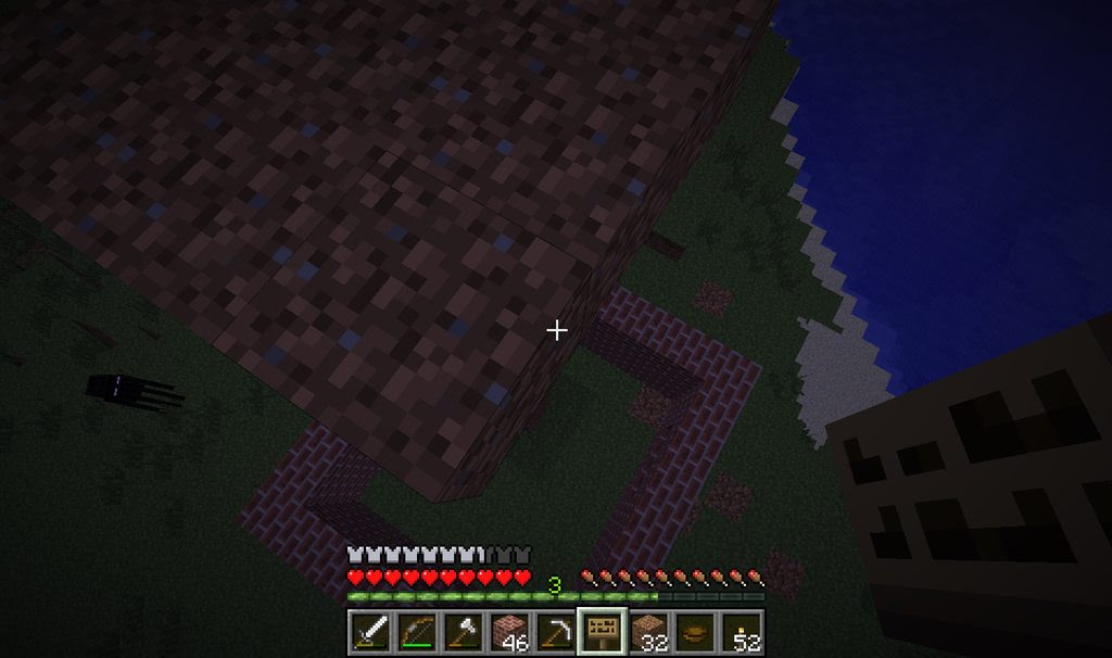 Over the night, two endermen wandered around and inside my house, picking up blocks of earth and popping in and out of existence. I tried my hardest not to look directly at them.