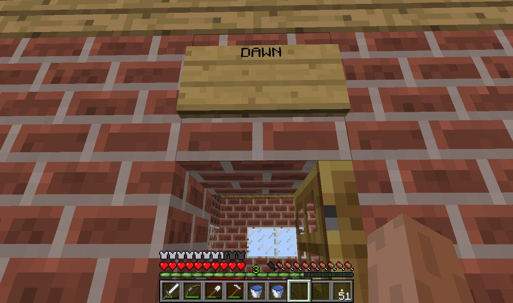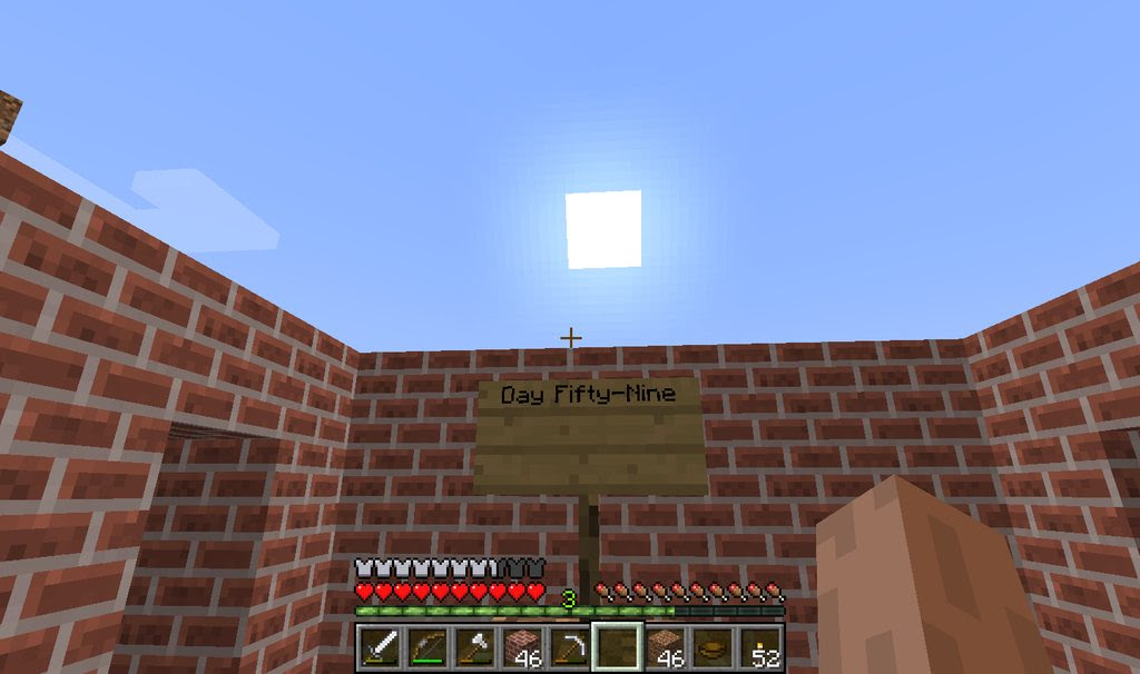 Instead of building my pillar, I blocked off the doorway with some blocks of dirt and crafted my bed. This was a defining moment. Until I slept in that bed, I could change my mind and go on. After I slept in, that would be it. There would be no going back. Death would take me back to the start of my adventure; it would merely bring me back here. I took a deep breath, clicked my mouse, and slept until morning.