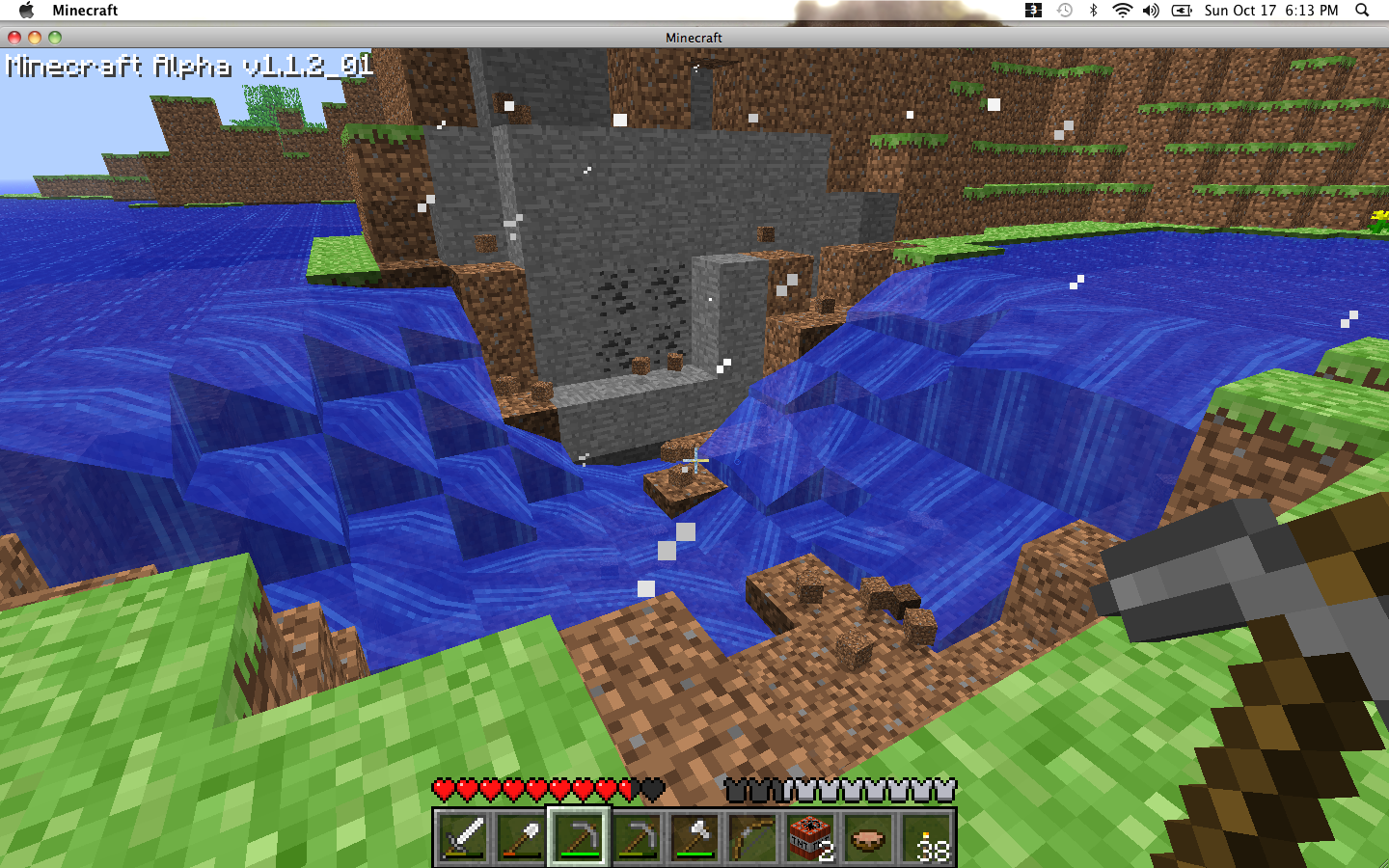 An explosives expert, I am not. I did not consider that the TNT may form a hole more than a block deep. In hindsight, that was a pretty big thing to overlook. I didn't like my chances, but I thought I may as well try to get my boat through anyhow. I had seen other people ride boats up waterfalls. Perhaps I could do that?