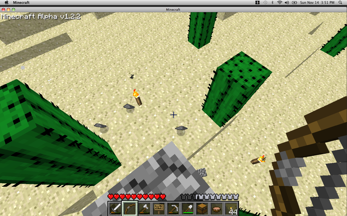 The sun was getting low and I would need to think about making camp soon. As my new form of shelter requires sand for my cacti defense, I decided to rest here in this desert rather than risk moving forward into new sandless land. Well, not that I have ever been too far from sand these past weeks, but it is best to play it safe.