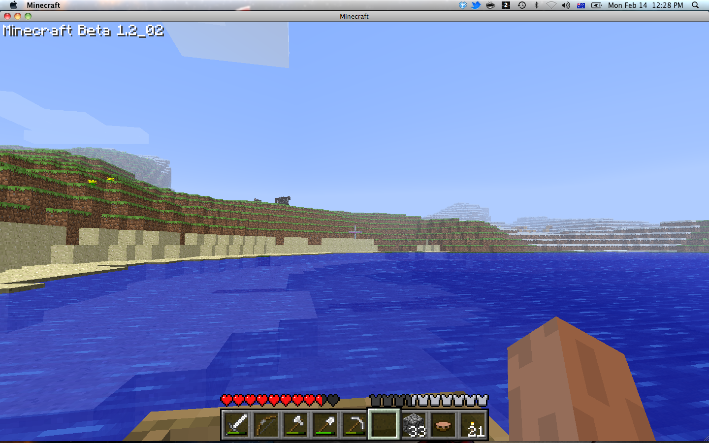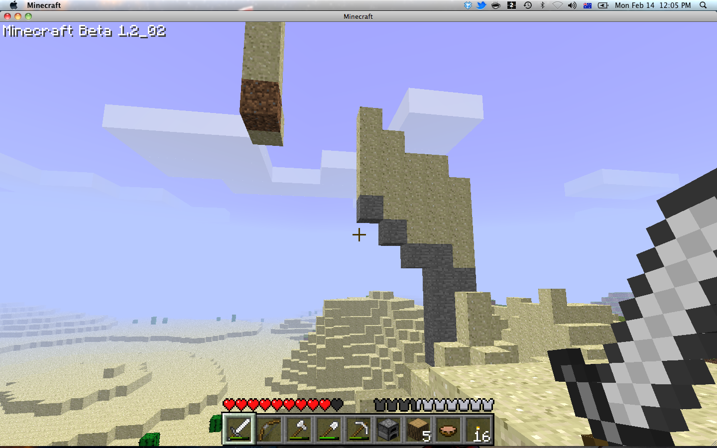 In hindsight, I should have attempted to chop down one of the strange trees to see if they dropped normal wood. I’m not sure why I never did this. Instead, I crafted myself a boat and set out east across the ocean, leaving the trees behind. It was not long before I stumbled across land—another desert.
